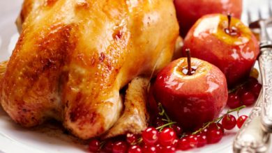 Poularde Fermière Label Rouge farcie, pommes rôties et groseilles