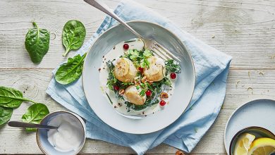 Noix de Saint-Jacques et épinards à la Crème Fraîche Chavroux®, groseilles et noisettes grillées
