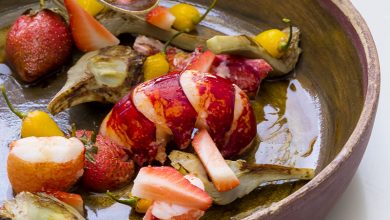 Homard en cocotte et fraises Gariguette Label Rouge, jus minute, artichaut poivrade