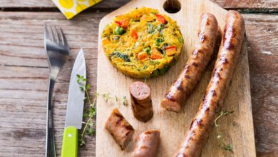 Chipolatas marinées, grillées et croustilles de légumes