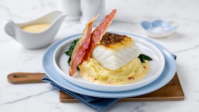 Skrei sur purée de pommes de terre, sauce à l’orange et jambon de Parme crunchy