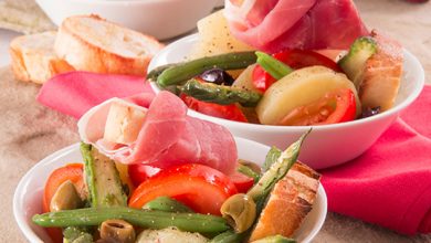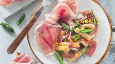 Salade niçoise de printemps avec des pommes de terre, asperges, haricots verts, olives et jambon de Parme