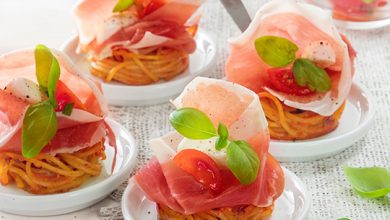 Nids de spaghettis frits, mozzarella et jambon de Parme