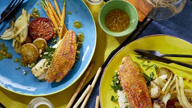 Filets de rouget, légumes printaniers, vinaigrette passion