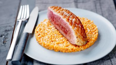 Magret de Canard Fermier des Landes fumé au foin, lentilles corail comme un risotto