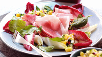 Salade de chicorée, jambon de Parme, “salsa” à la mangue