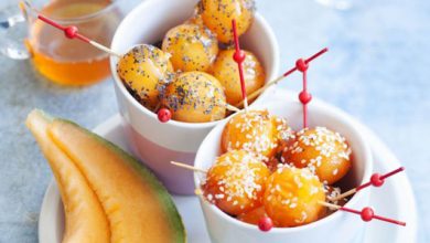Brochettes de Billes Multicolores (Melon de nos Régions, Mozzarella, Betterave et Mangue) et son Sirop Balsamique