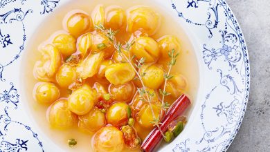 Soupe de Mirabelles de Lorraine, mascarpone à la vanille, nougatine de pistache