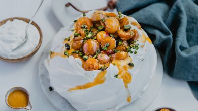 Pavlova pistaches et Mirabelles de Lorraine