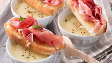 Soupe à l’oignon et aux pommes de terre, tartines de pain gratinées et Jambon de Parme