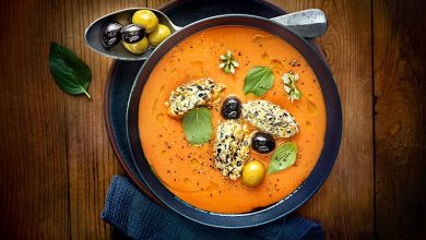 Velouté de tomates au chèvre frais, quenelle de concassé aux deux olives