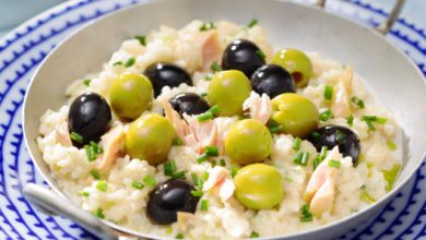 Riz Bomba, bouillon aux olives vertes et noires et crème au thon
