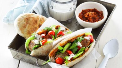 Sandwich pita aux boulettes de lentilles et olives noires, sauce Provençale Tramier, yaourt grec et crudités
