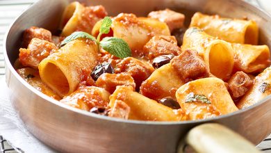 Penne au ragù d’épaule d’agneau à la tomate et aux olives noires