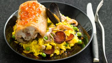 Blancs de seiche, moules, palourdes sur lit de riz rouge de Camargue façon Paëlla