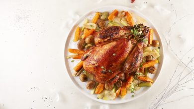 Pintade Fermière farcie au pains d’épices et garnies de fruits d’hiver