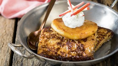 Pain d’épices façon pain perdu, Pink Lady® crue et caramélisée, crème au mascarpone vanillé