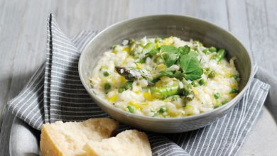 Risotto aux asperges, petits pois et fondue aux 4 fromages