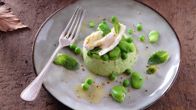 Velouté tiède de fèves et de petits pois à la crème de chèvre