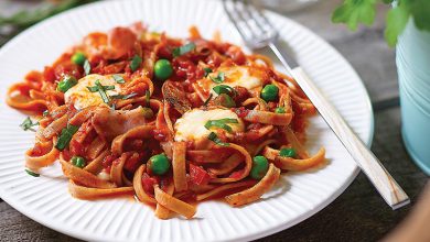 Fettucine aux petits pois, mozzarella et lard grillé, Sauce Romaine