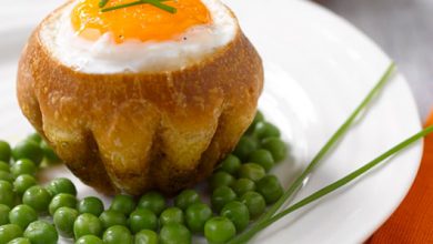 L’oeuf surprise en nid de brioche sur lit de petits pois