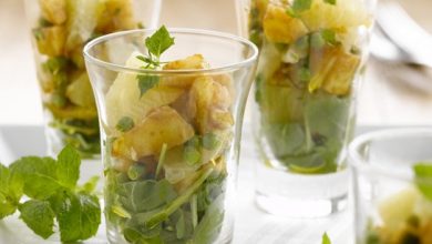 Fraîcheur de pommes de terre, petits pois, pomelos et roquette