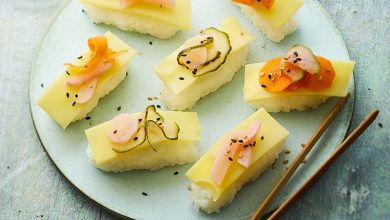 Sashimi de riz vinaigré au sésame, lamelles d’Emmentaler AOP Suisse et légumes frais en pickles