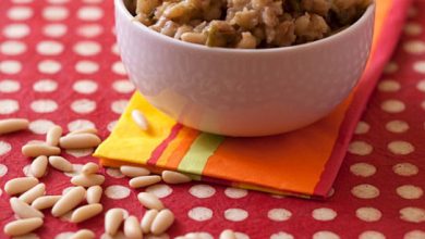Mijoté d’orge aux courgettes, pignons et raisins secs