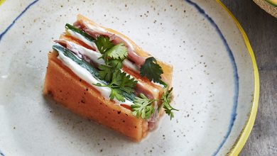 Melon du Haut-Poitou et concombre en pickles fines tranches de jambon sec, condiment chèvre et piment d’Espelette