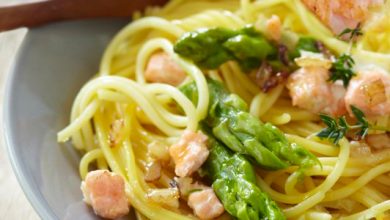 Spaghettis printaniers aux asperges vertes et saumon, sans gluten