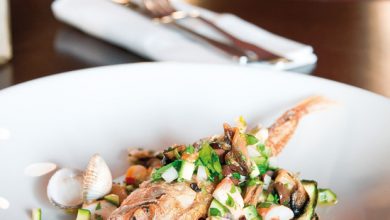 Courgette snackée, Rouget et vinaigrette de Coquillages