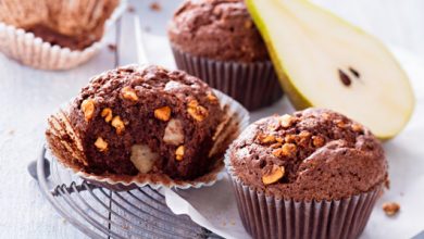 Muffins chocolat aux poires pochées et noisettes caramélisées