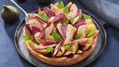Tarte merveilleuse, poires, magret fumé et foie gras