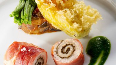 Queue de Lotte rôtie au jambon noir de Bigorre et tapenade, Ratatouille de légumes du jardin et tempura de fleurs de courgettes