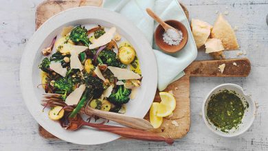 Salade chaude de pousses de brocolis, pommes de terre nouvelles et Parmigiano Reggiano