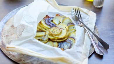 Pommes de terre de primeur en papillote au lard paysan et à l’oignon rouge