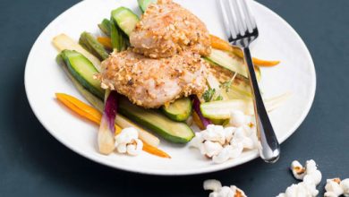 Écrasés de salsifis, médaillons de lotte et pop-corn