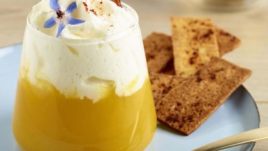 Potage en verrine, crème de Chaource AOP, chips de lard et croûton mouillette
