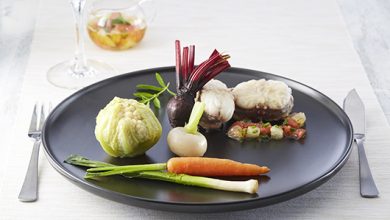 Lotte sautée avec sa fantaisie de mini-légumes, sauce vierge aux pamplemousses et au gingembre