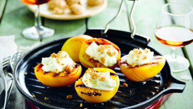 Pêches grillées, amaretto et biscuits amaretti emiettés