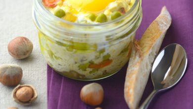 Œufs cocottes et poêlée jardinière à la ricotta parsemés de noisettes grillées
