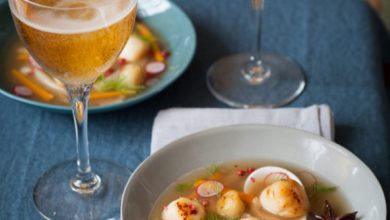 Saint-Jacques panées, accompagnées d’un consommé au jambon ConsorcioSerrano
