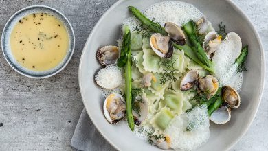 Ravioles aux Comté et basilic, noix du Dauphiné et poireau