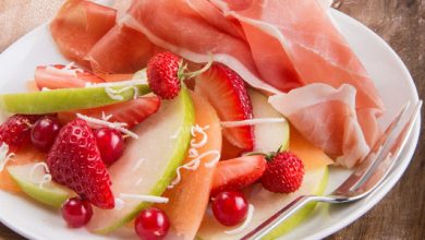 Salade de fruits, Jambon de Parme et ricotta fumée