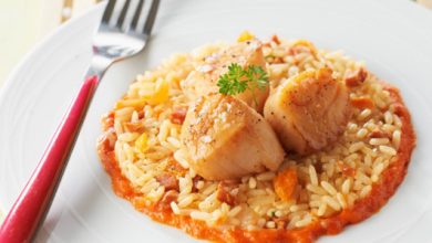 Riz à poêler chorizo et tomates séchées – Noix de St-Jacques sauce poivron rouge