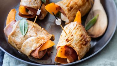 Coquilles Saint-Jacques enrobées de jambon de Parme et de sauge, sauce Marsala