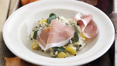 Risotto d’automne : Jambon de Parme, potiron, gorgonzola et sauge