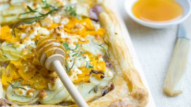 Tarte fine pomme de terre, potiron et feta au miel d’Acacia