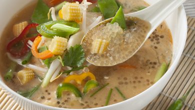 Soupe thaï de Perles Japon, légumes et lait de coco