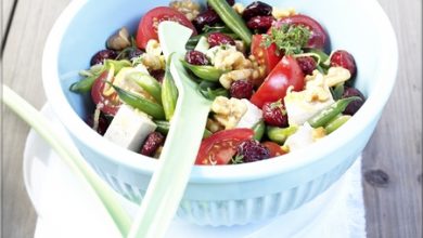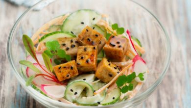 Salade de melon, tomates cerises, mélange 4 céréales précuites & tofu au basilic